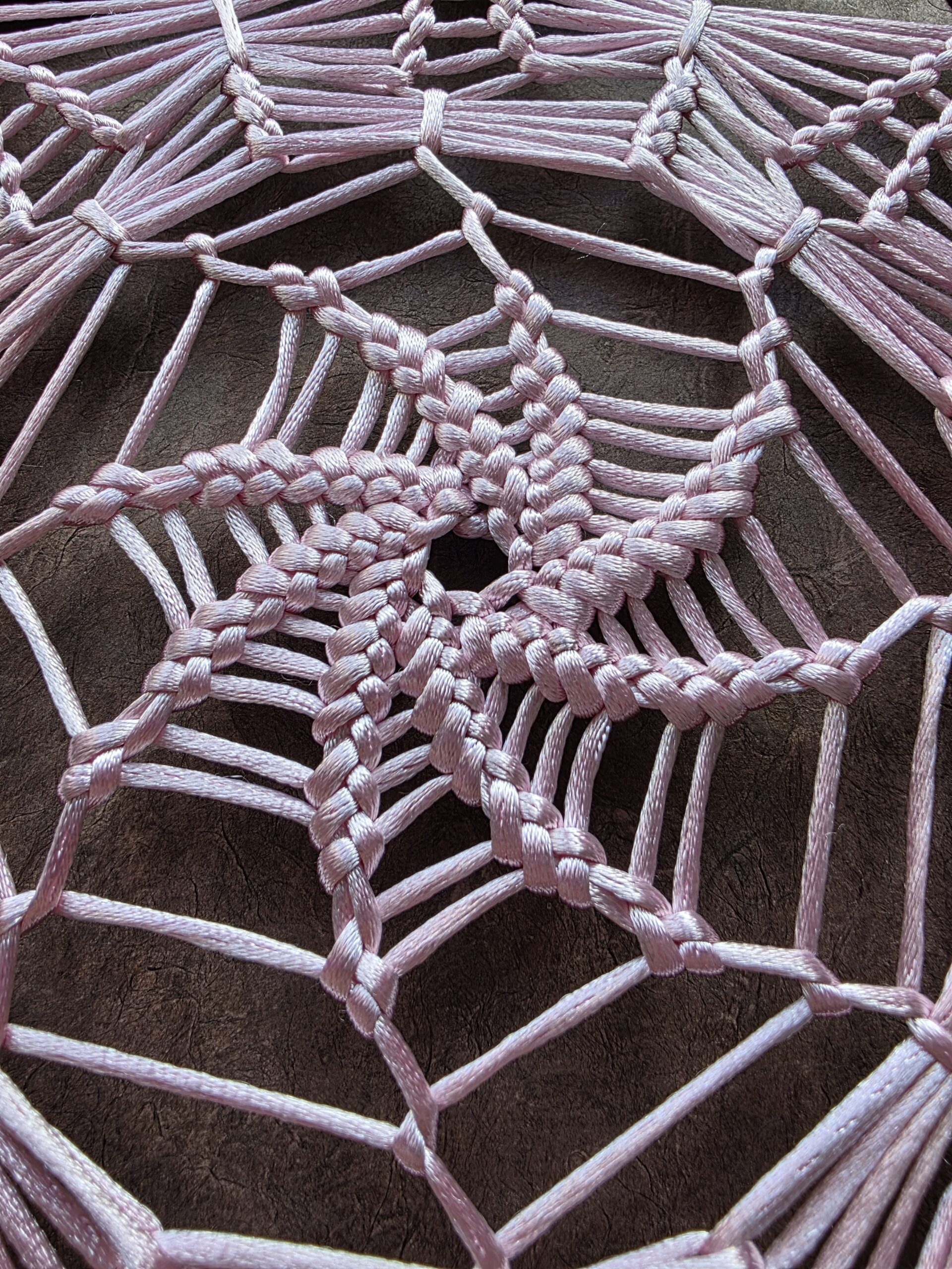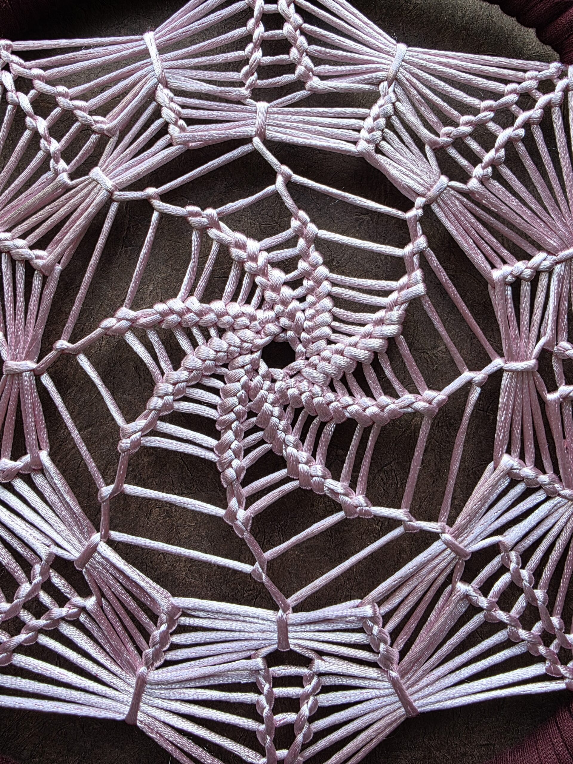 Hecho sobre aro metálico con trapillo e hilo grueso de color rosa metalizado.
