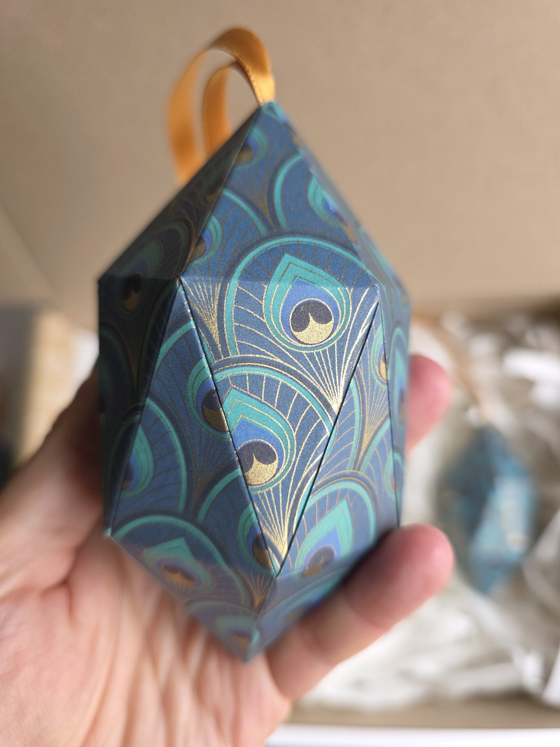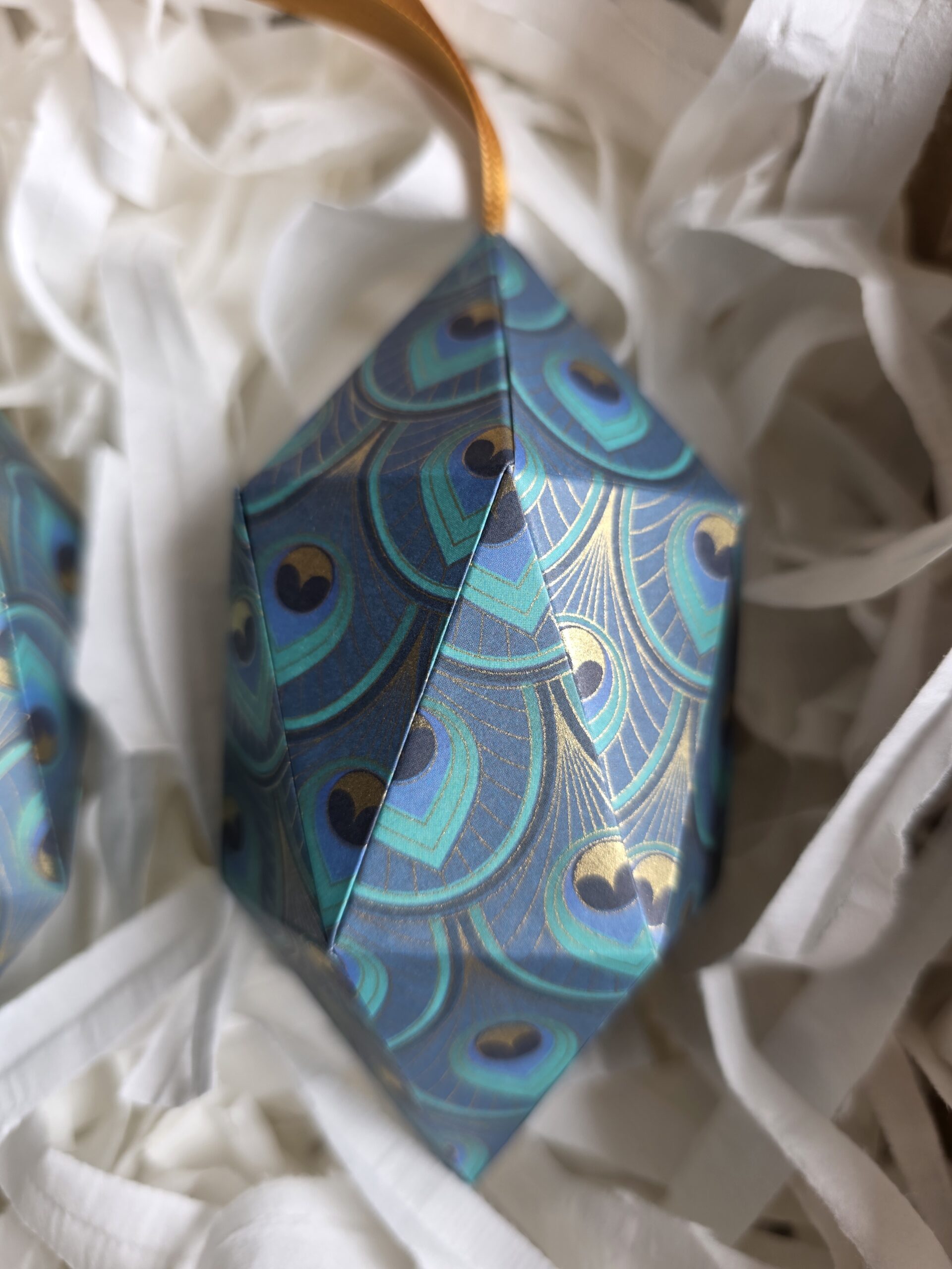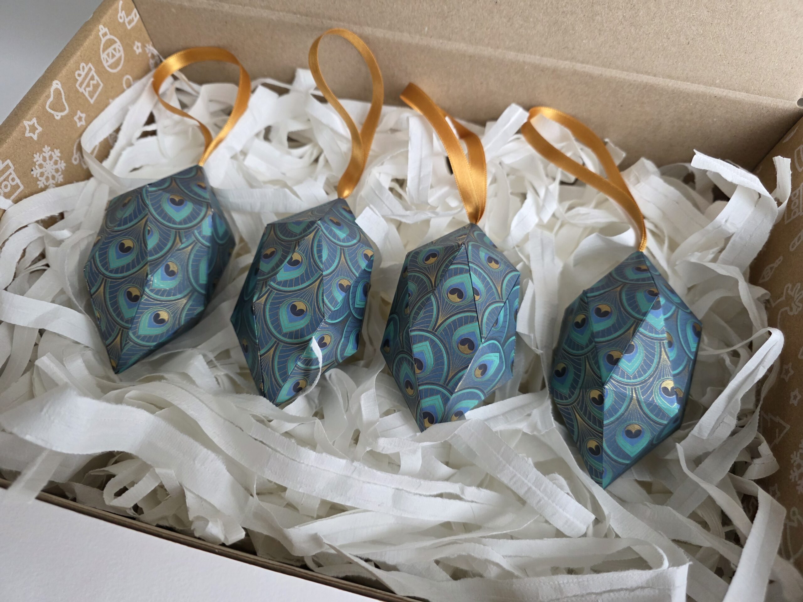 Pack de 4 adornos de kusudama para árbol de Navidad, en forma de dodecaedro con módulos romboidales.