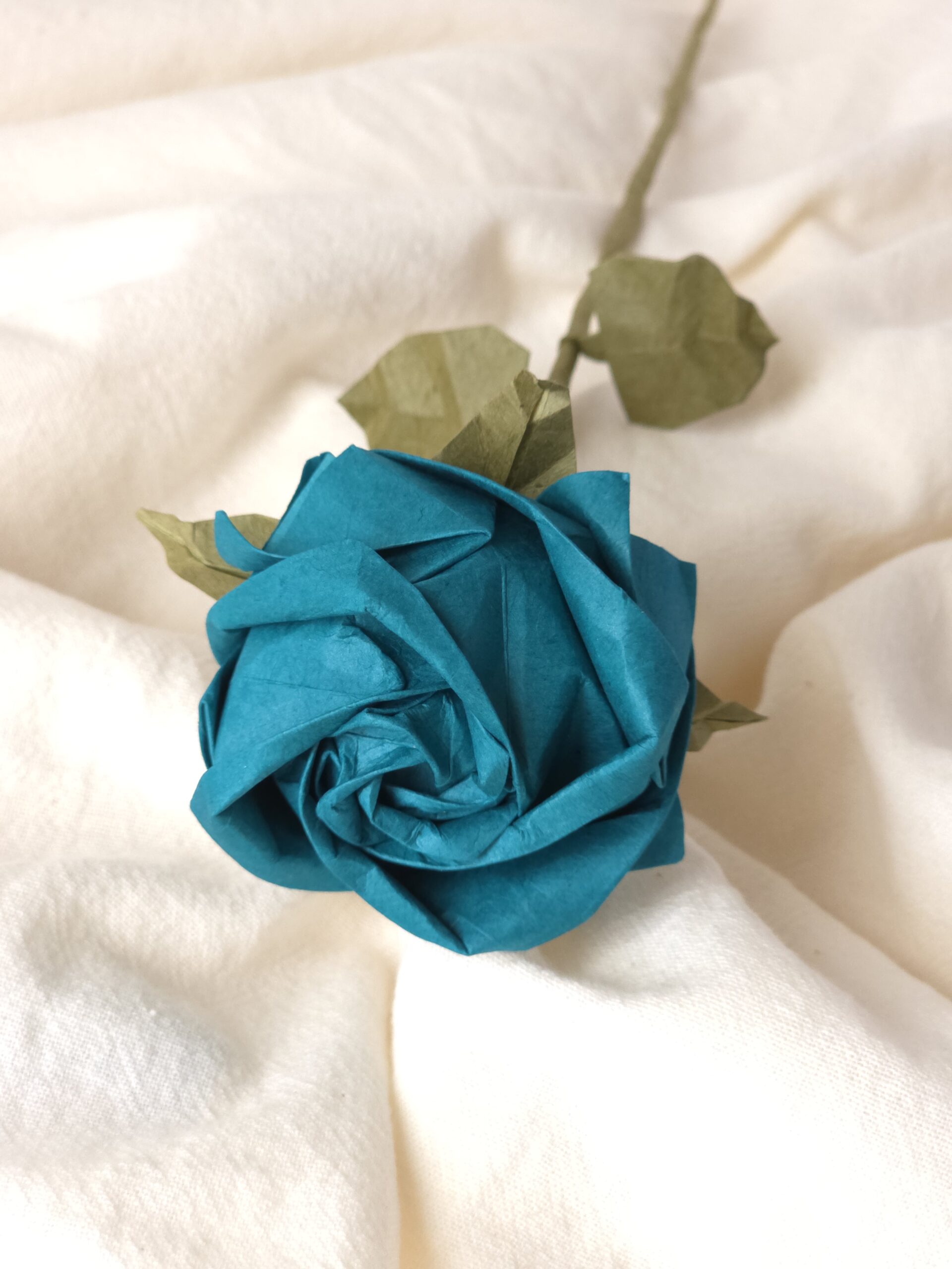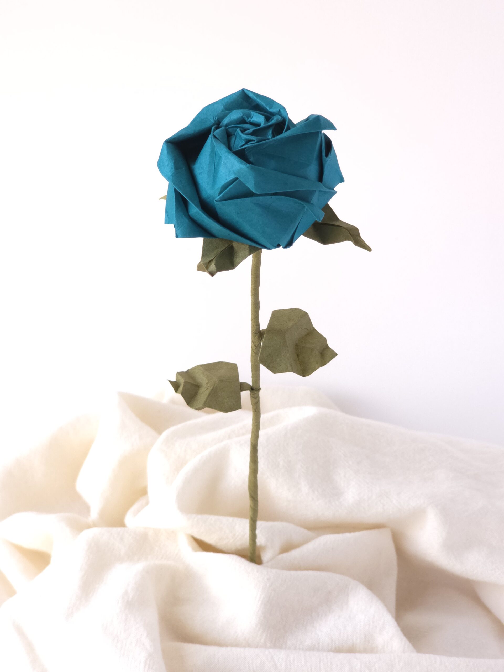 Rosa azul de origami, hecha a mano con papel japonés de primera calidad.