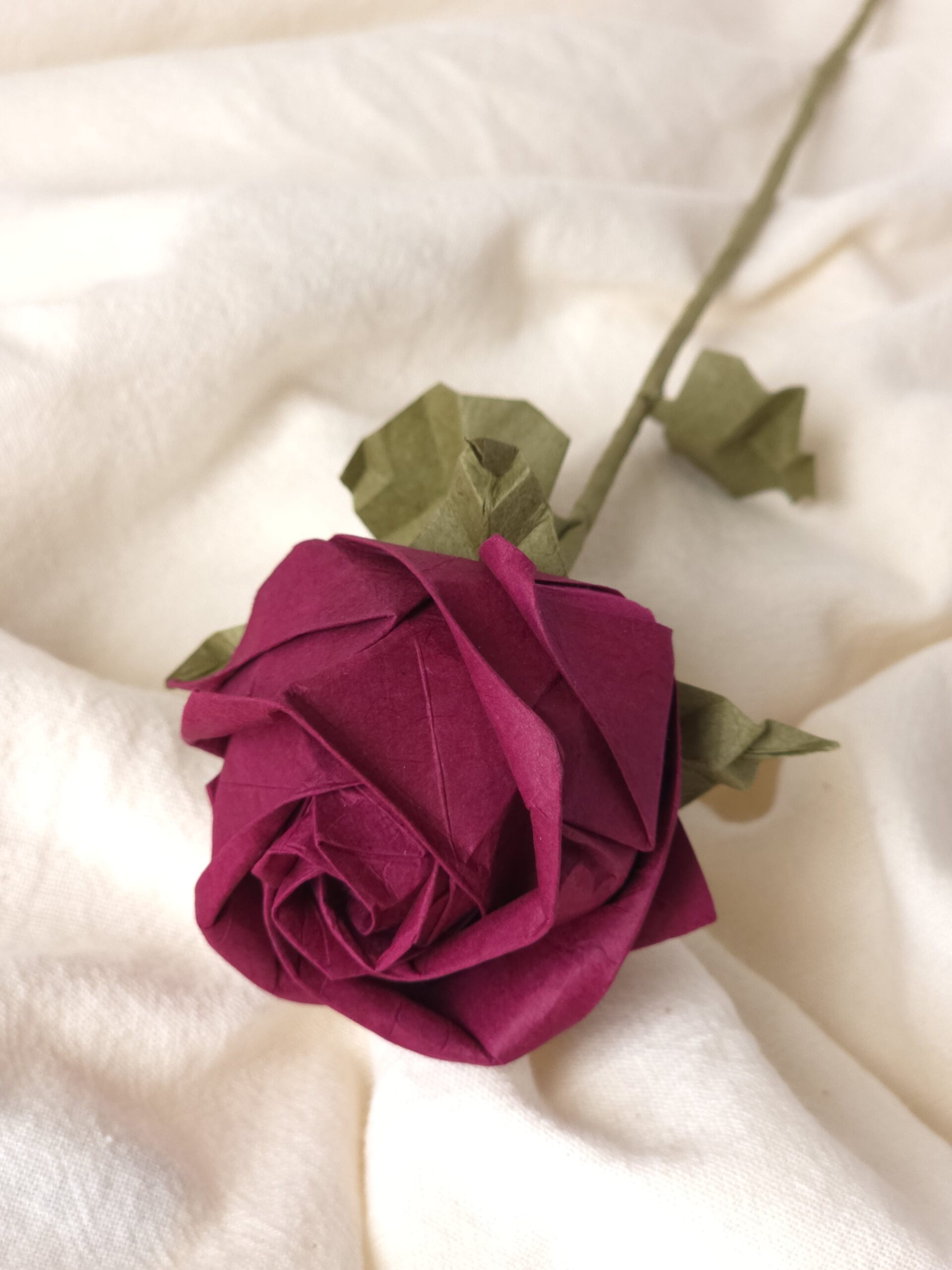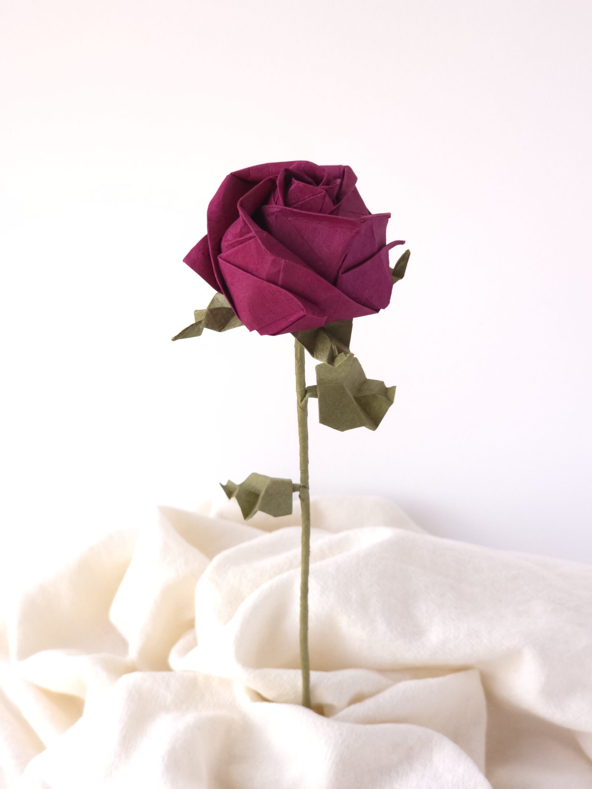 Rosa burdeos de origami, hecha a mano con papel japonés de primera calidad.