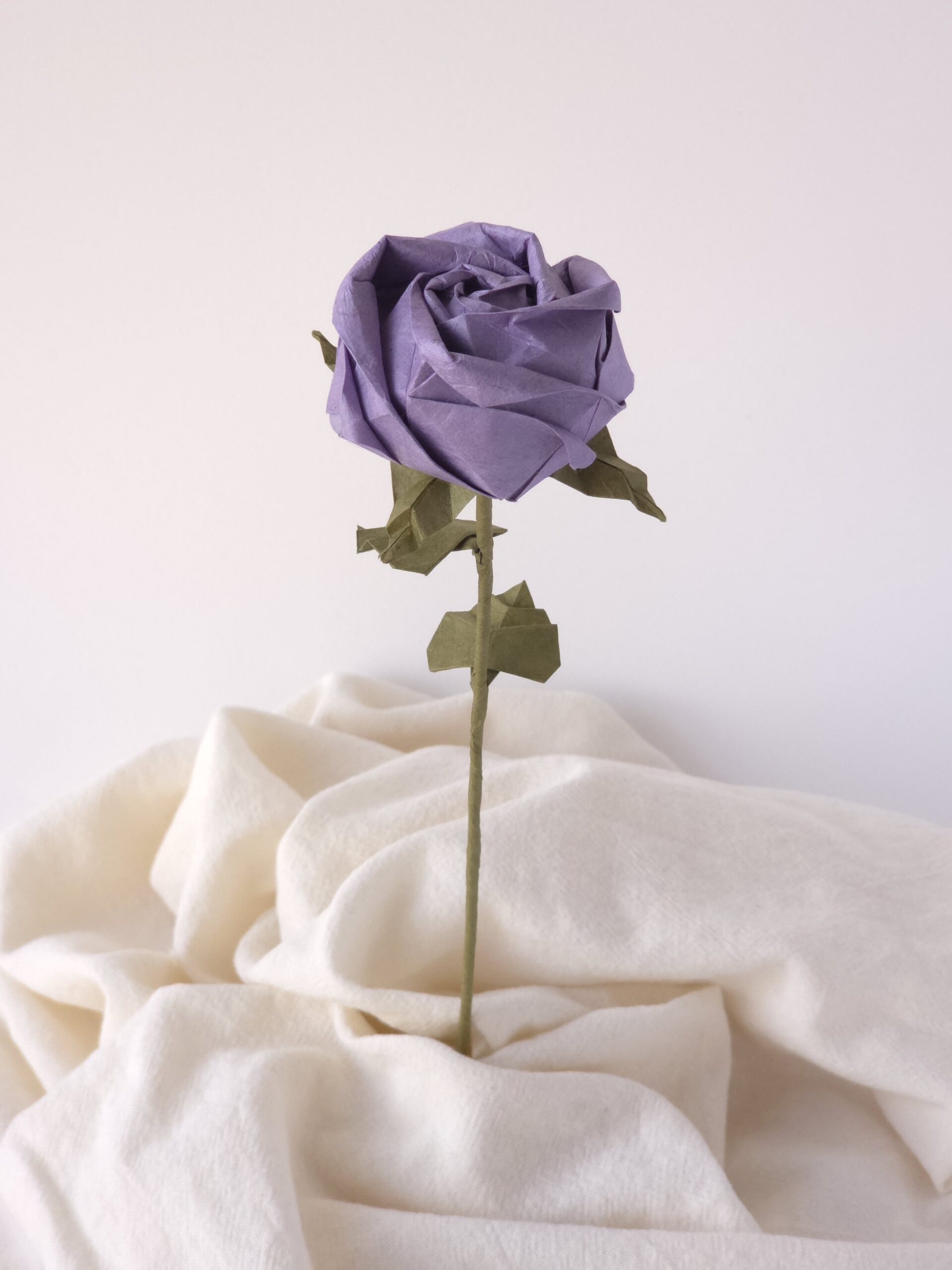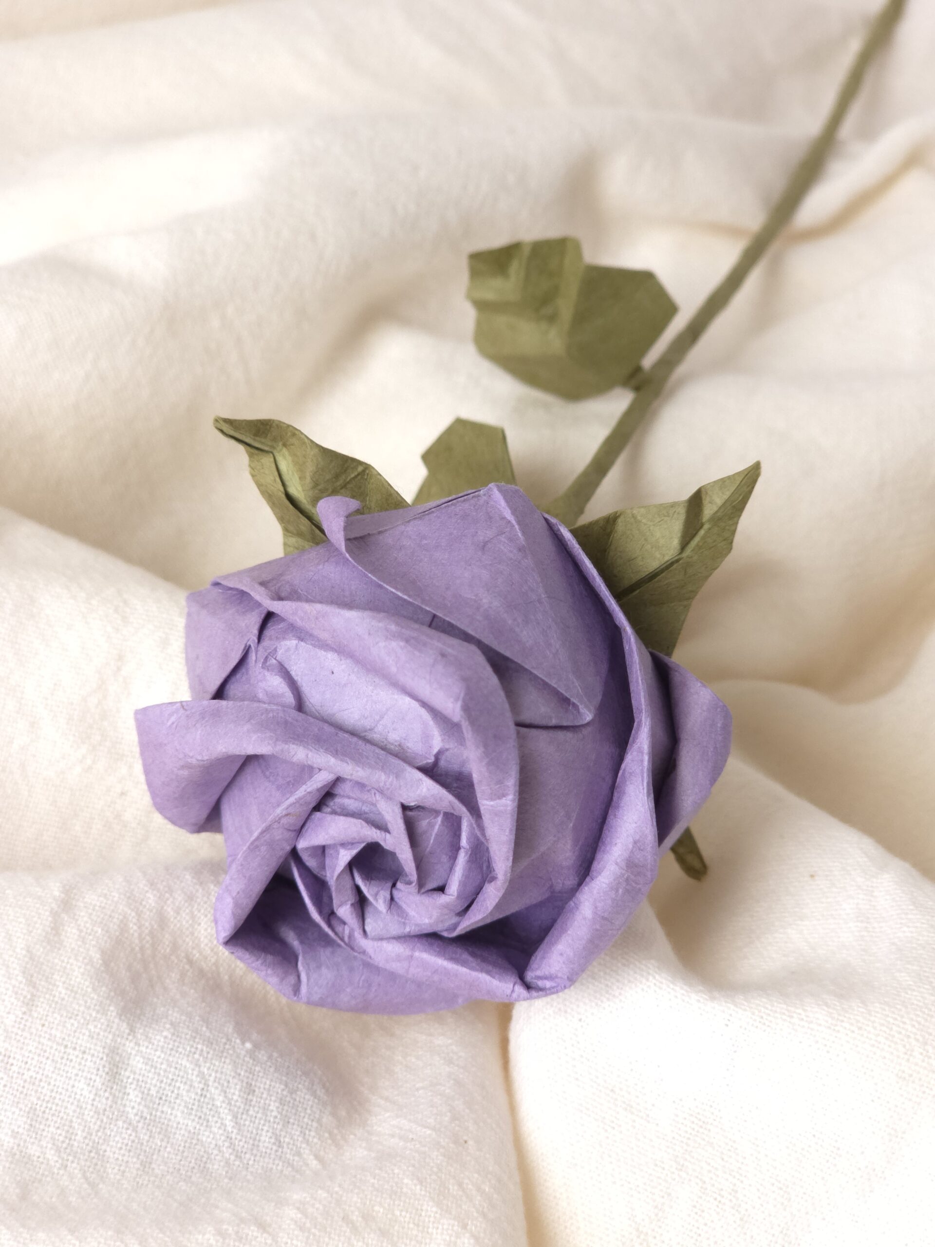 Rosa lila intenso de origami, hecha a mano con papel japonés de primera calidad.
