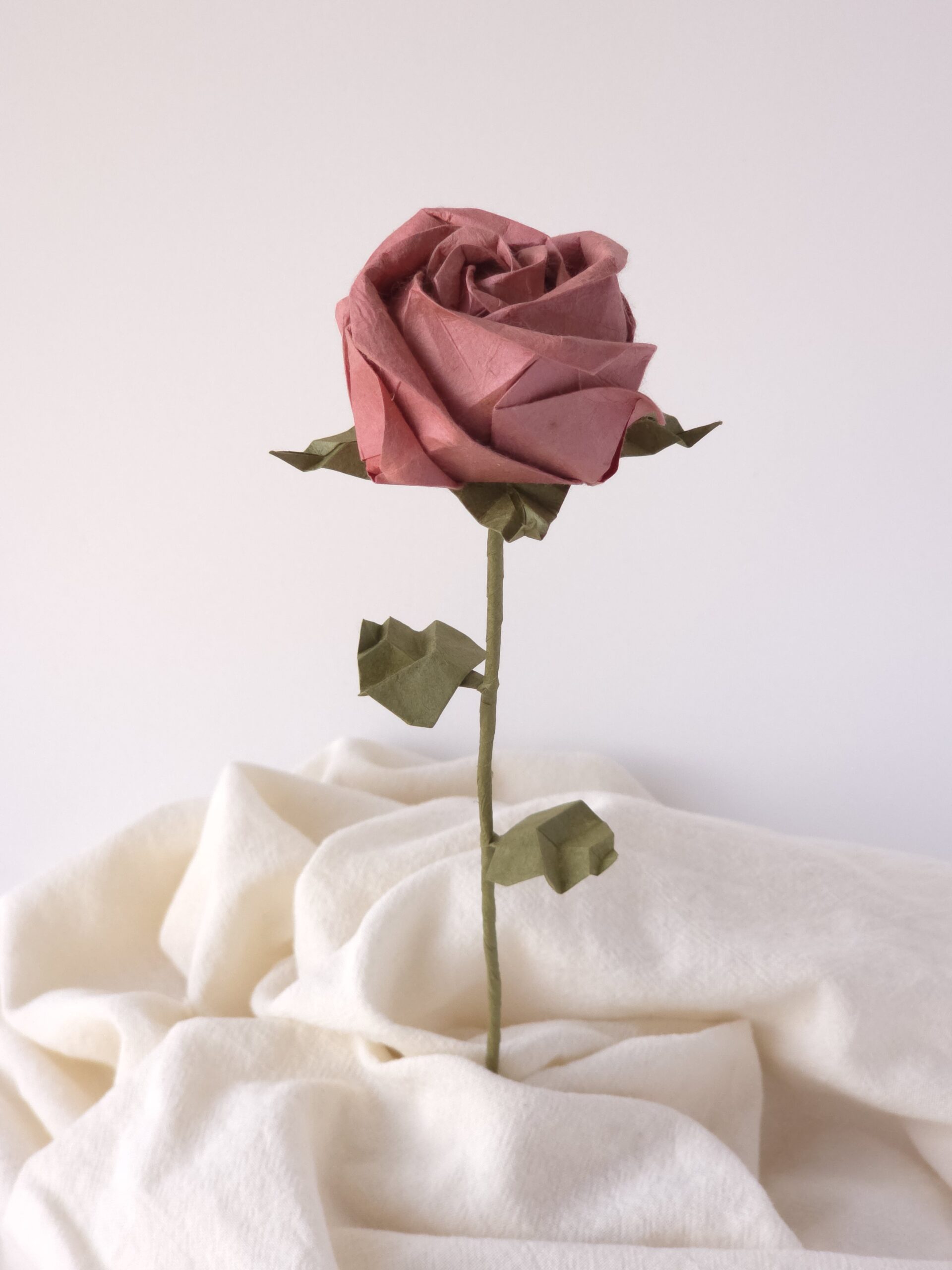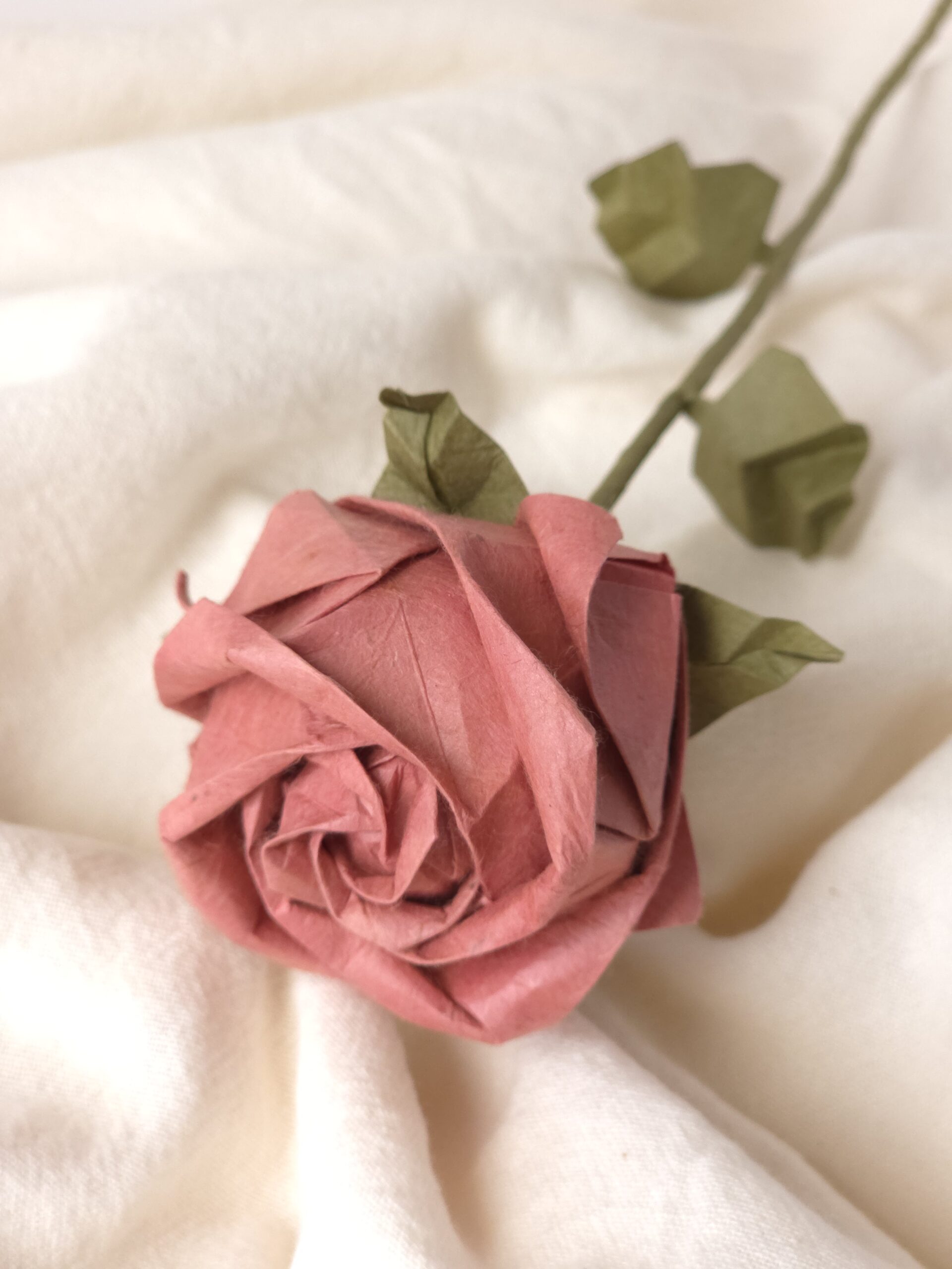 Rosa palo de origami, hecha a mano con papel japonés de primera calidad.
